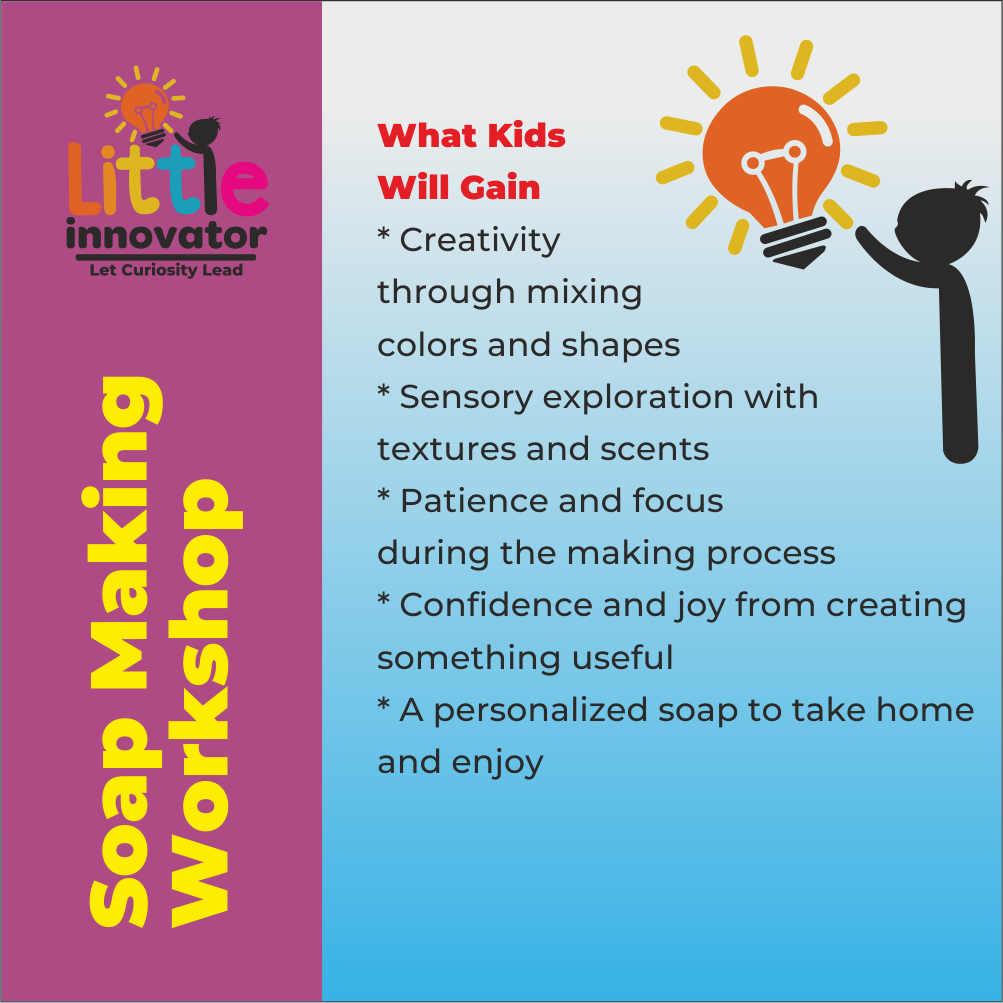 Çocuklar, güvenli ve çocuk dostu malzemeler kullanarak renkli ve eğlenceli şekilli sabunlar yaparak sabun yapım sanatını keşfedecekler. Renkleri karıştırabilir, kokuları seçebilir ve kendi tasarımlarını kalıplara dökebilirler. Bu uygulamalı atölye, yaratıcılığı duyusal keşifle birleştirerek her çocuğun benzersiz eseriyle gurur duymasını sağlar.